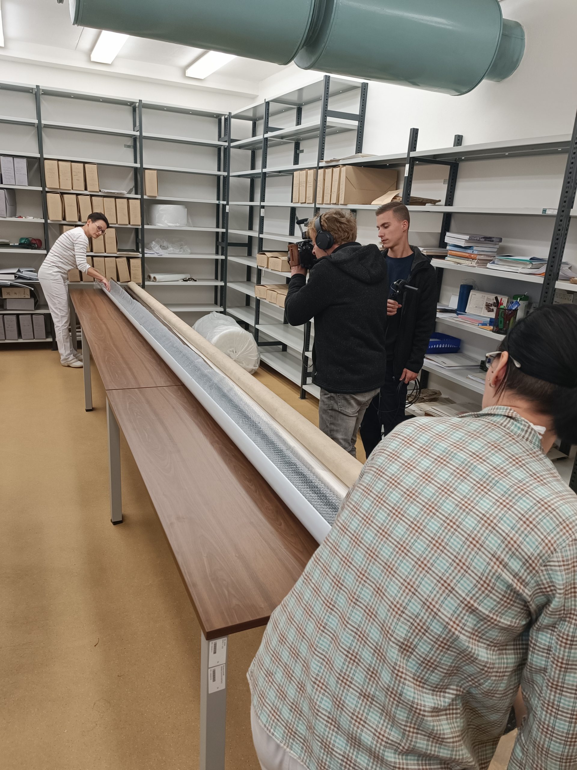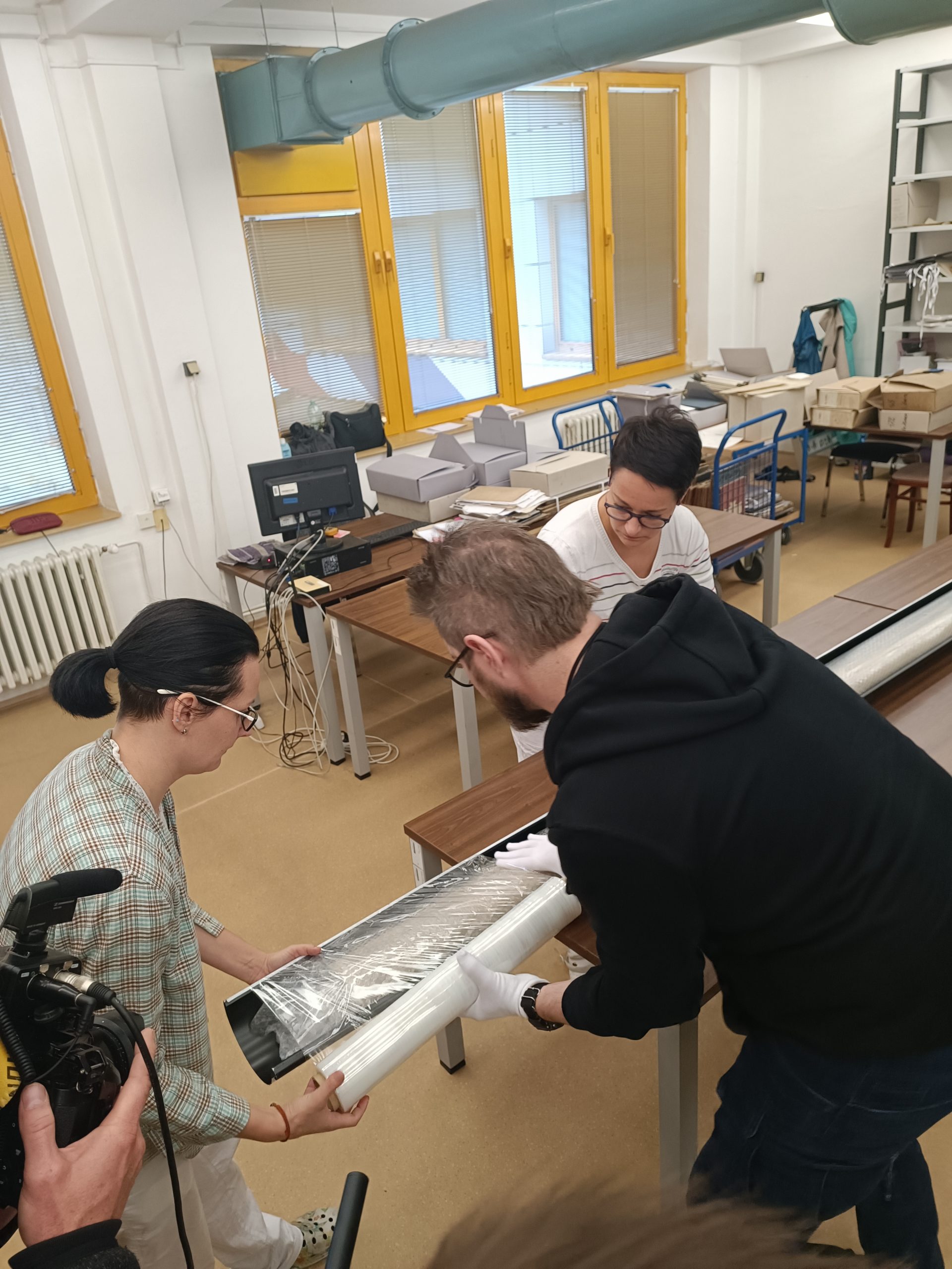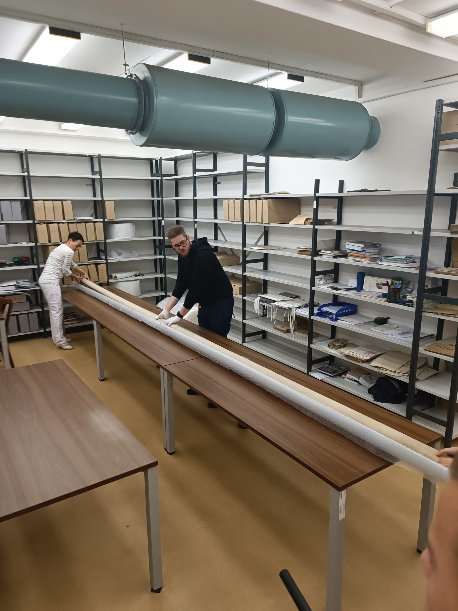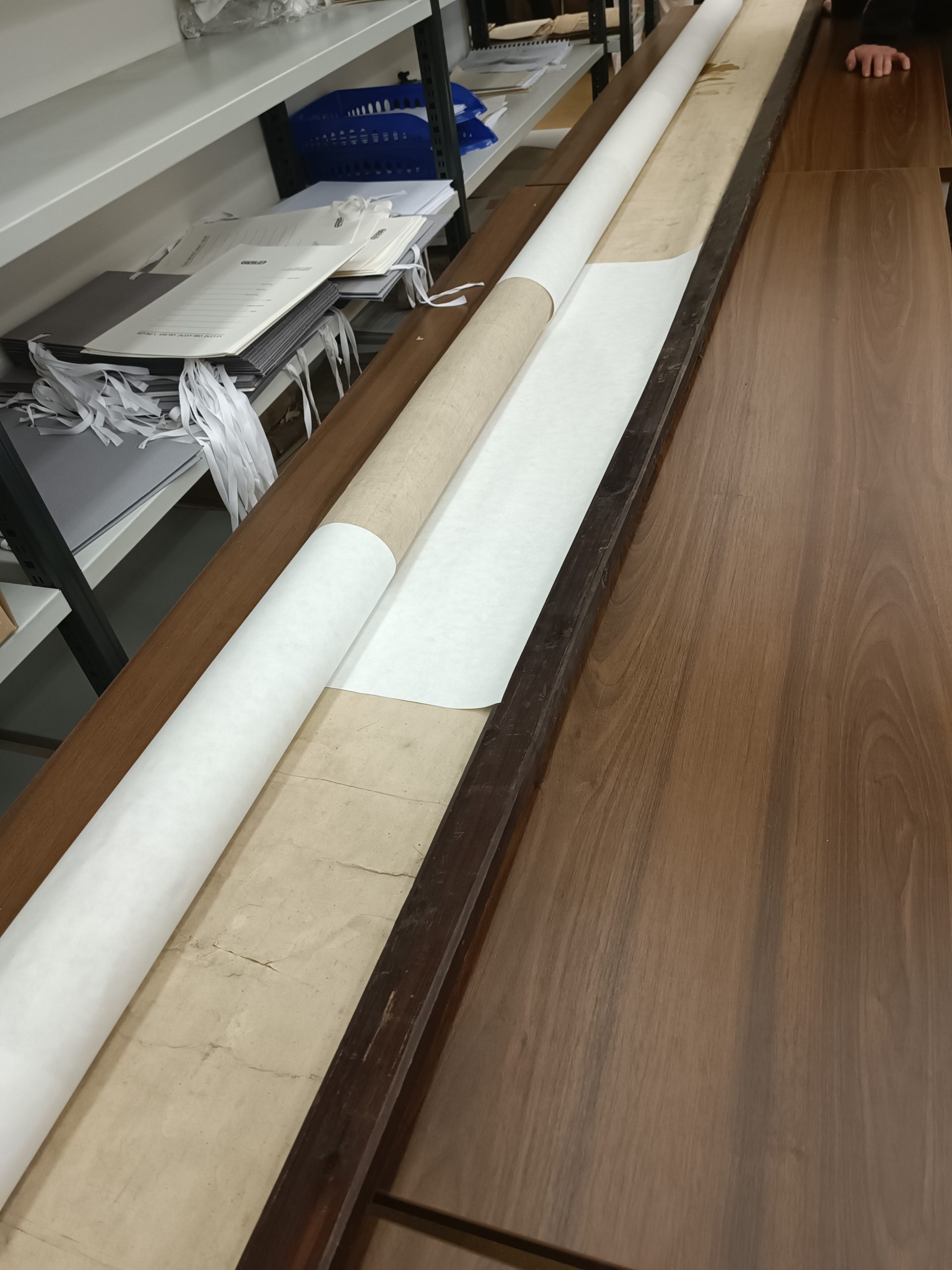 Již vynesení mapy z archivu byl oříšek. Do výtahu se nevešla, jelikož její délka byla 7 metrů, a po schodišti také nešla vytočit. Nakonec se muselo využít požární schodiště, kde se mapa protáhla úzkou mezerou mezi schodišti. I pro transport muselo být objednáno stěhovací vozidlo s krytou ložní plochou délky 7 metrů.